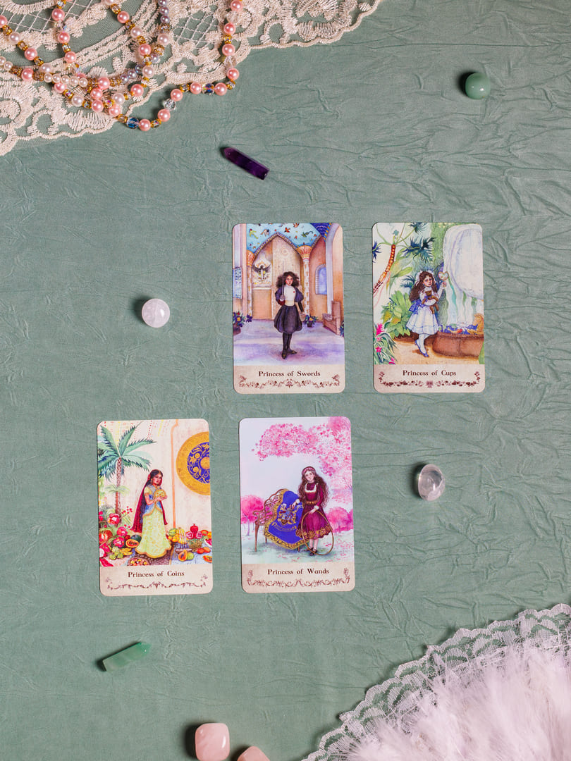 В колоде традиционные Пажи заменены на Принцесс. Такой выбор является осознанным символическим жестом. Он сохраняет гендерный и архетипический баланс: в каждой масти представлены две женские и две мужские фигуры. Принцессы символизируют возможности, образ энергии первых шагов, женский архетип, связанный с любопытством, открытостью и стремлением проявить себя.