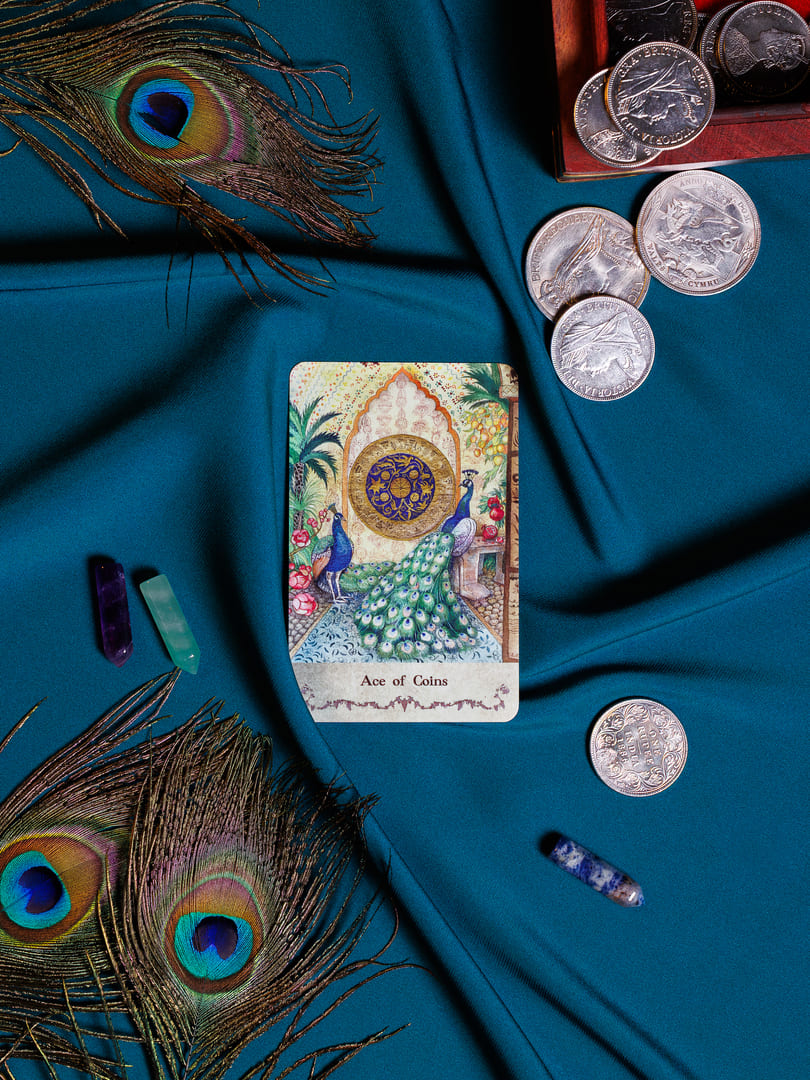 - Монеты — Лето: плодородие и материальные дары. В колоде они связаны с Индией как «имперской житницей» и в контексте эпохи соотносятся с богатством, поступавшим из колоний.