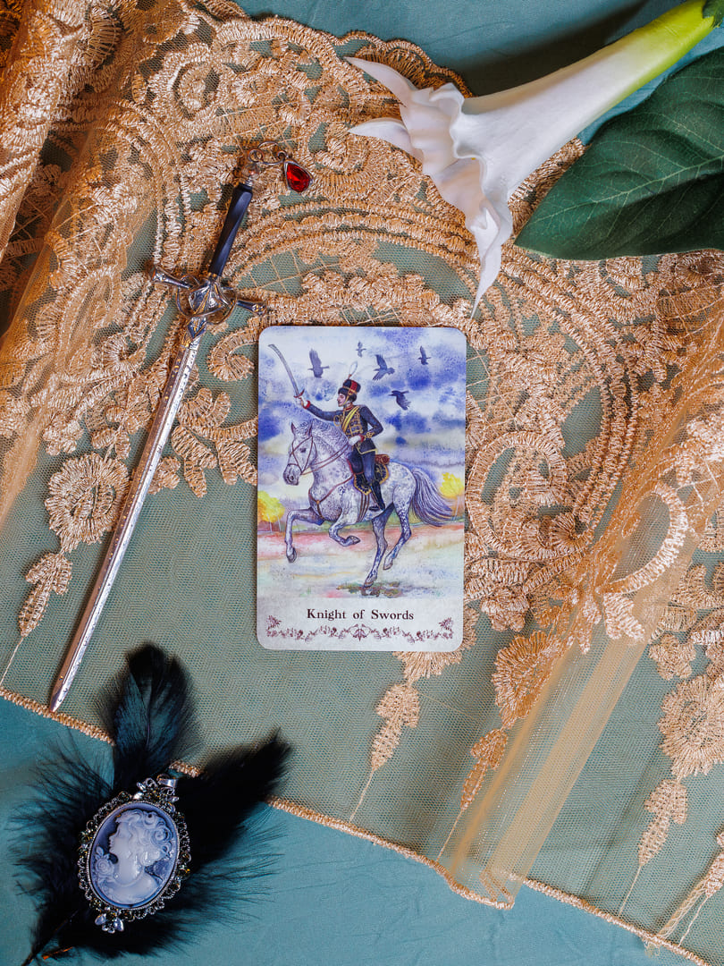 - Мечи — Осень: обнажение сути в условиях конфликта и напряжения. Эта масть связана с военной тематикой и символизирует процесс, болезненный, но очищающий и избавляющий от иллюзий.